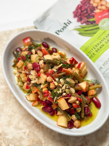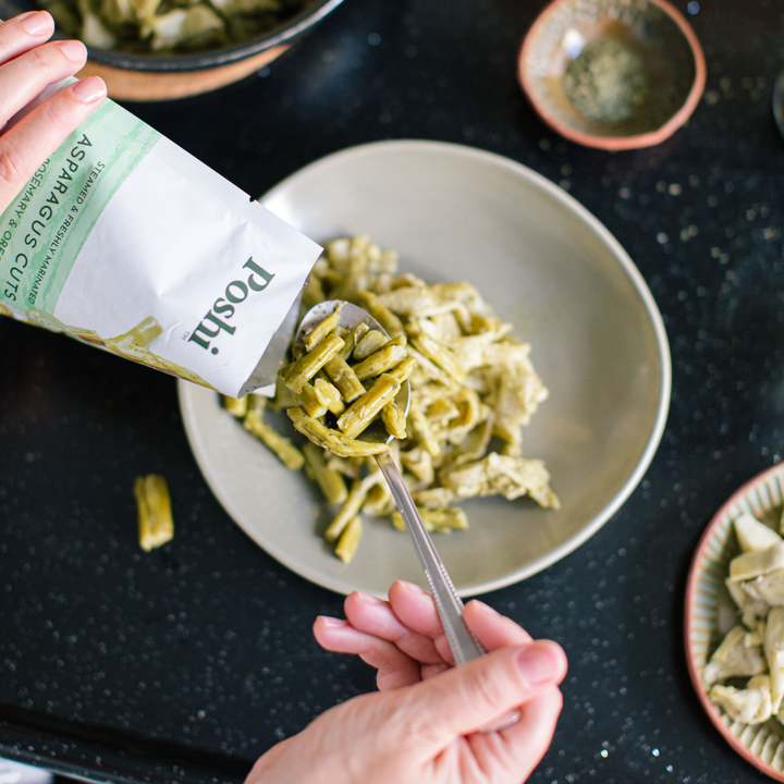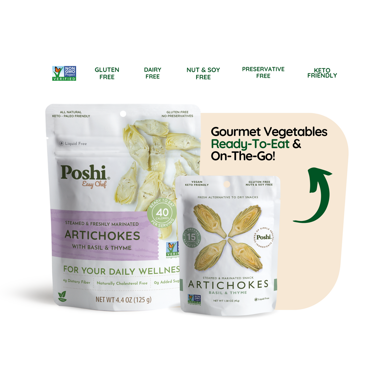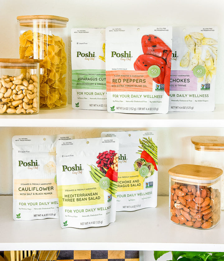 Poshi stands for "Power Of Simple Healthy Ingredients." It is simply all-natural premium veggies made easy! - lightly marinated with Mediterranean herbs, peeled, and steamed to maintain texture and easy digestion.